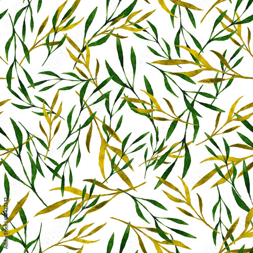 © miraelart, Naklejka premium Watercolor seamless pattern with green leaves and branches on a white background, hand drawn watercolor illustration for fabric, textile, wrapping paper, card, invitation, wallpaper, web design.