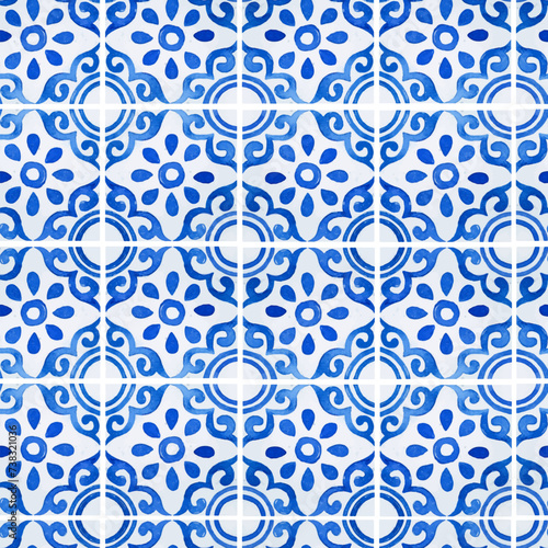 © Uli Prozorova, Fototapeta premium Watercolor seamless pattern with simple Mediterranean tiles for wallpaper and wrapping paper