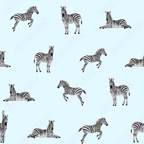 Obraz premium Watercolor Seamless Pattern with Zebras for printing on paper, packaging, wrapping on a blue background.