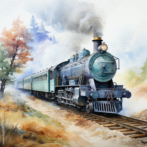 © Artist, Fototapeta premium Watercolor Seamless STEAM TRAIN Illustration, Generative Ai