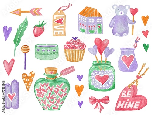 Fototapeta premium Watercolor set for Valentine's Day. Hearts, sweets, candles , decorations,...
