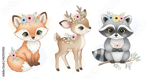 © TamimTech, Naklejka premium Watercolor set of forest cartoon isolated cute baby fox, deer, raccoon and owl animal with flowers. Nursery woodland illustration. Bohemian boho drawing for nursery poster, pattern