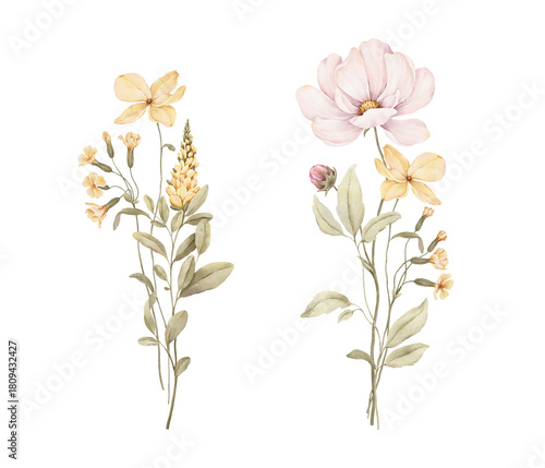 © Nikole, Fototapeta premium Watercolor set with delicate bouquets of green plants, blossom yellow and pink flowers. Hand-drawn design compositions for your cards, banners, poster or floral print. Isolated aquarelle illustration.