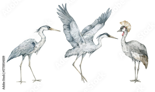 © Kate K., Naklejka premium Watercolor set with wild tropical birds. Grey crowned crane, grey heron. Cute safari wildlife animal