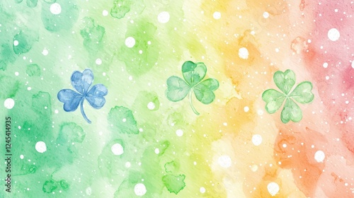 Fototapeta premium Watercolor shamrocks on rainbow background with splatters and dots