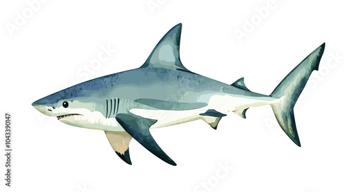 © The Illustraitor, Naklejka premium Watercolor shark on a white background. Scary jaws and angry sharks swimming in the ocean. Inhabitant in the waters of the oceans. Vector illustration