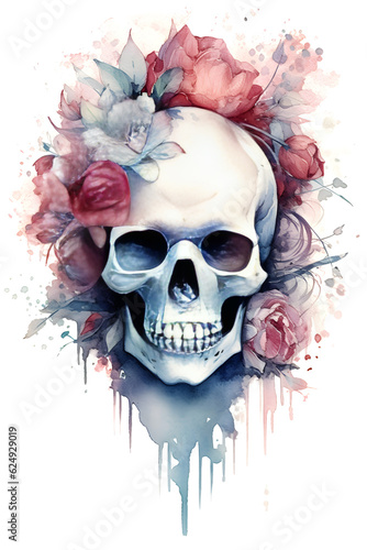 Fototapeta premium watercolor skull and roses, generative ai