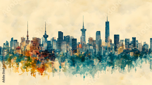 © lismiyatun, Fototapeta premium Watercolor Skyline Cityscape