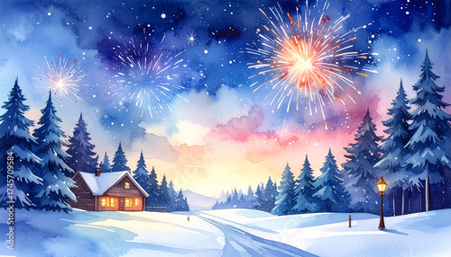 Fototapeta premium Watercolor snowy Christmas night with colorful fireworks sky