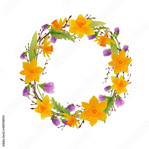 © Оксана К., Obraz premium Watercolor spring wreath isolated with birch twigs and flowers
