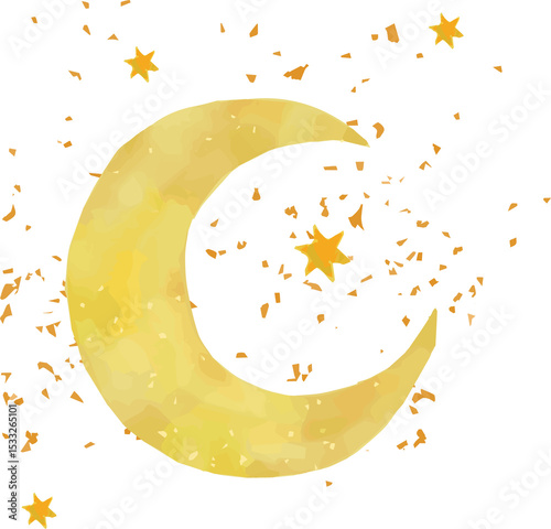 © vectorfusionart, Naklejka premium Watercolor-style crescent moon is floating on transparent background with gold stars and confetti