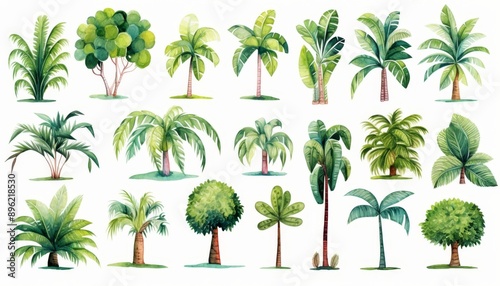 © QuietWord, Obraz premium watercolor style illustration of summer tropical tree collection set, cartoon illustration isolated on white background,