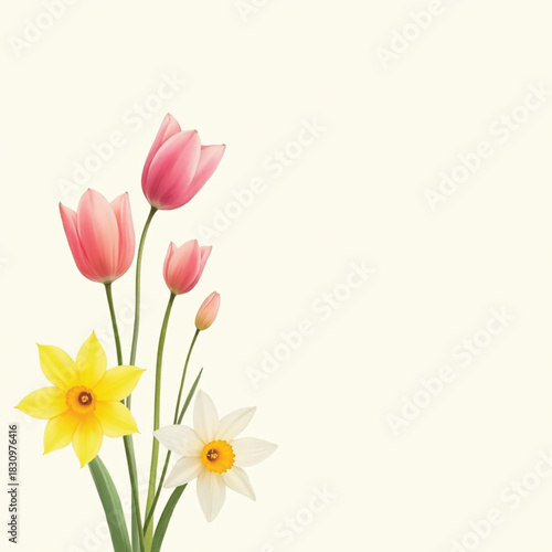 © Kamrulislam, Naklejka premium Watercolor Style Vibrant Spring Tulips and Daffodils Bouquet