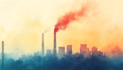 © Amp&BoY Studio, Obraz premium watercolor styled climtae changing disaster illustration, chimney with smog