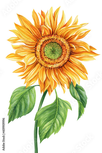 Fototapeta premium Watercolor sunflower isolated on white background. Botanical painting. Yellow flower hand painted illustration
