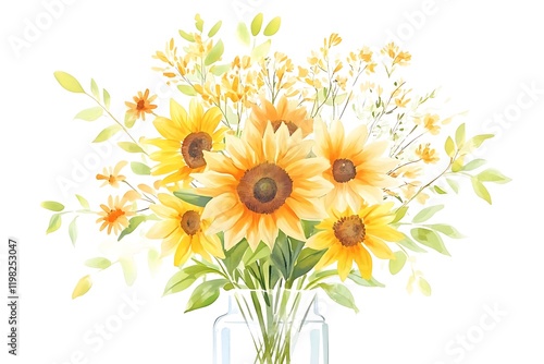 Fototapeta premium Watercolor Sunflowers and Delicate Blooms in Glass Vase