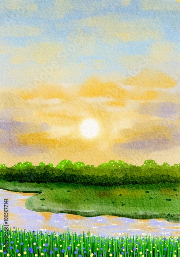 © Hhanaz, Fototapeta premium Watercolor Sunrise Landscape with River and Meadow