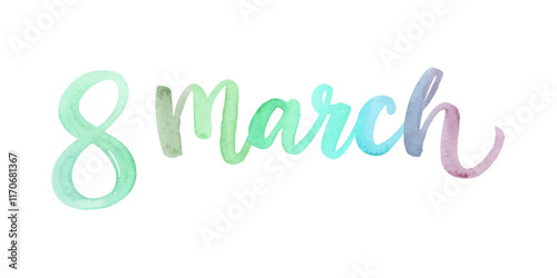 Fototapeta premium Watercolor text design, March 8, International Women's Day, colorful lettering, artistic style, celebration theme.