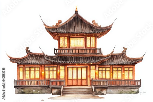 © Mahbubur, Obraz premium Watercolor traditional Asian pagoda with glowing windows and intricate serene architectural design