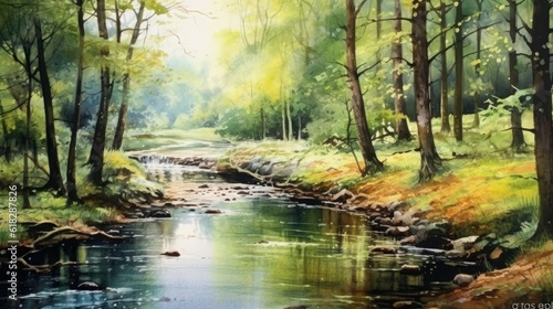 Fototapeta premium Watercolor tranquil river flowing through a forest. AI generated
