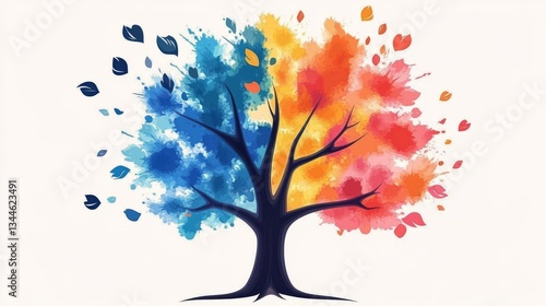 Fototapeta premium Watercolor Tree of Seasons Abstract Art with Colorful Leaves, Nature , Seasons