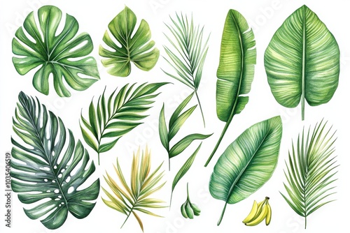 Obraz premium Watercolor Tropical Leaf Collection - Green Botanical Elements, Isolated Jungle Foliage, Palm Leaf, Banana, Watercolor Illustration, Tropical Leaves, Jungle Plants