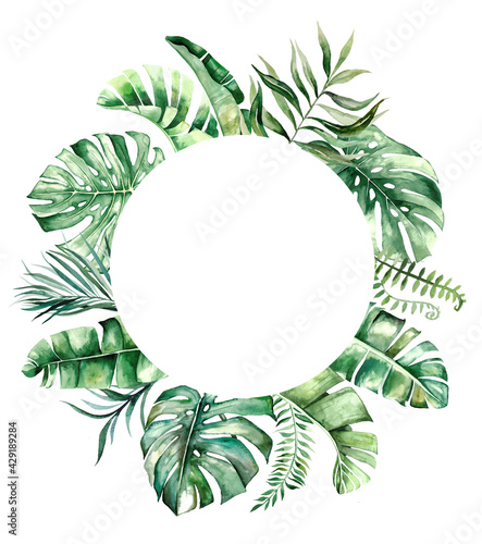 © katrinshine, Naklejka premium Watercolor tropical leaves frame illustration