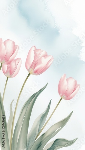 © 1997 . SUNFLOWER, Fototapeta premium Watercolor Tulip on a blue sky Background.