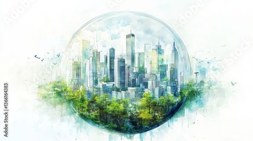 © Nonthawat, Fototapeta premium Watercolor Urban Greenery in a Bubble Surrounded by Futuristic Cityscape