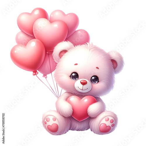 Obraz premium Watercolor Valentine Cute Teddy Bear With Heart Shaped Red Balloons Clipart PNG Graphic, AI Generated.