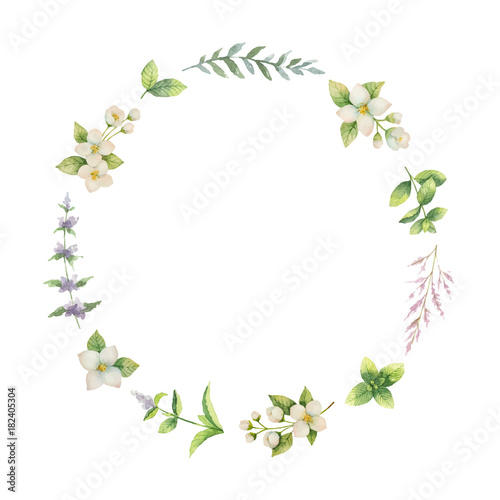 © ElenaMedvedeva, Fototapeta premium Watercolor vector frame of Jasmine and mint branches isolated on white background.