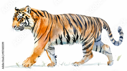 © Thiago, Naklejka premium Watercolor walking tiger in profile on a white background. Tiger. Illustration