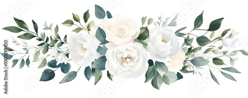 Fototapeta premium Watercolor white floral bouquet arrangement with roses, peonies, and eucalyptus leaves on an isolated background,