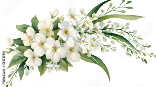Fototapeta premium Watercolor White Flower Bouquet with Green Leaves on White Background, Cutout File for Wedding Clipart, Featuring Elegant Floral Arrangement in Soft and Natural Style