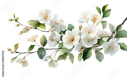 © Popular design, Fototapeta premium Watercolor white flowers and green leaves on a branch, simple vector PNG clipart isolated on a transparent background