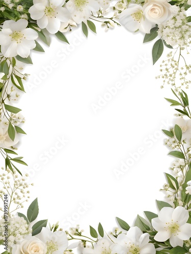 © hrdesigner97, Naklejka premium Watercolor White Rose & Baby's Breath Floral Border Template, Printable Blank Invitation Background