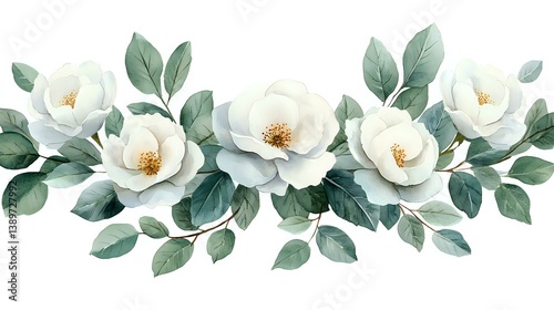 © Yuliia, Fototapeta premium Watercolor white roses garland with sage green leaves and buds arranged in horizontal composition on white background, isolated floral design element.