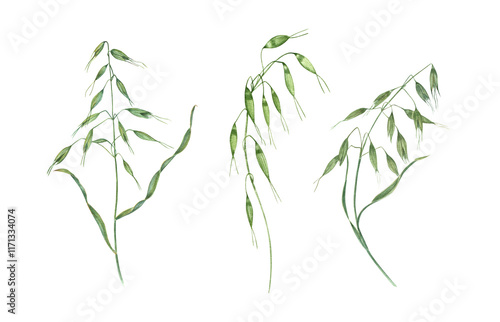 Fototapeta premium Watercolor wild meadow oats illustration clip art. Three green spikelet of...