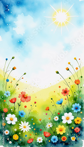 Obraz premium Watercolor wildflowers under a bright sun with blue sky and green meadow