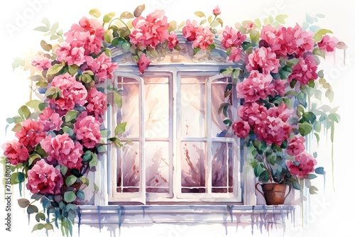 © hungryai, Fototapeta premium Watercolor window with pink bougainvillea flowers. Hand drawn illustration