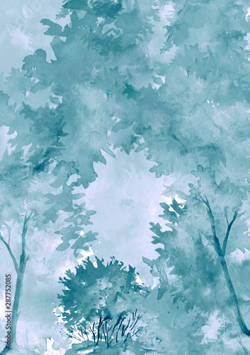 Fototapeta premium Watercolor winter blue wood. Blue, purple silhouette, landscape, trees and...