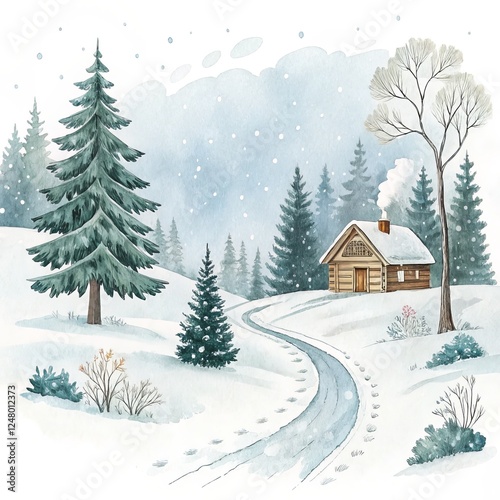 Naklejka premium Watercolor Winter Cabin Landscape Snowy Path, Forest, Composition, Winter...