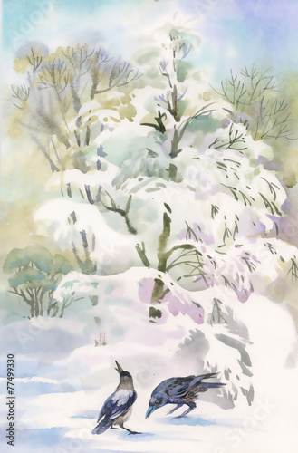 © kostanproff, Obraz premium Watercolor winter forest with trees and birds