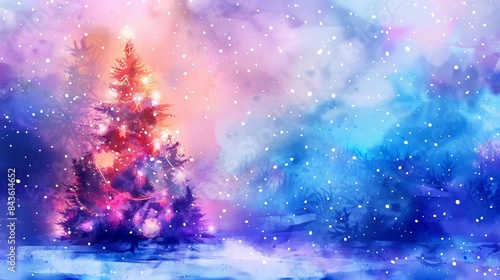 © Jafree, Obraz premium Watercolor Winter Wonderland with Illuminated Christmas Tree. Concept of holiday season, festive decorations, snowy landscape. Copy space