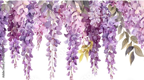 © NIPAPORN, Naklejka premium Watercolor wisteria clipart with cascading purple blooms.