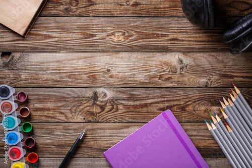 Obraz premium Watercolors, color pencils and sketchbook on wooden table. Flat lay photo...