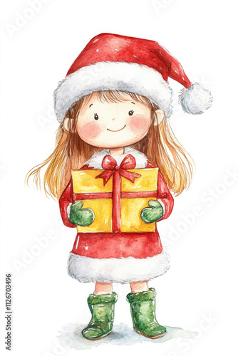 © grapestock, Fototapeta premium Watercolour painting of happy cute little girl wearing Santa Claus costume holding gift box over white background, Happy new year and merry Christmas concept, illustration poster