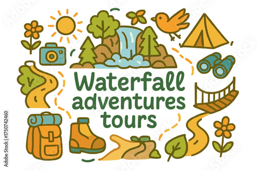 Fototapeta premium Waterfall Adventure Doodles. Waterfall adventures tours. Hand-drawn doodle...