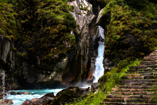Fototapeta premium Waterfall among the himalaya mountains with green forest and a river full of rocks.