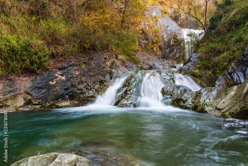 © Nicola Simeoni, Fototapeta premium Waterfall and autumn colors. Magic of the Julian pre-Alps.